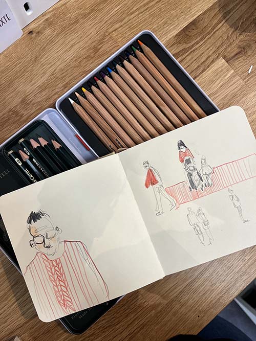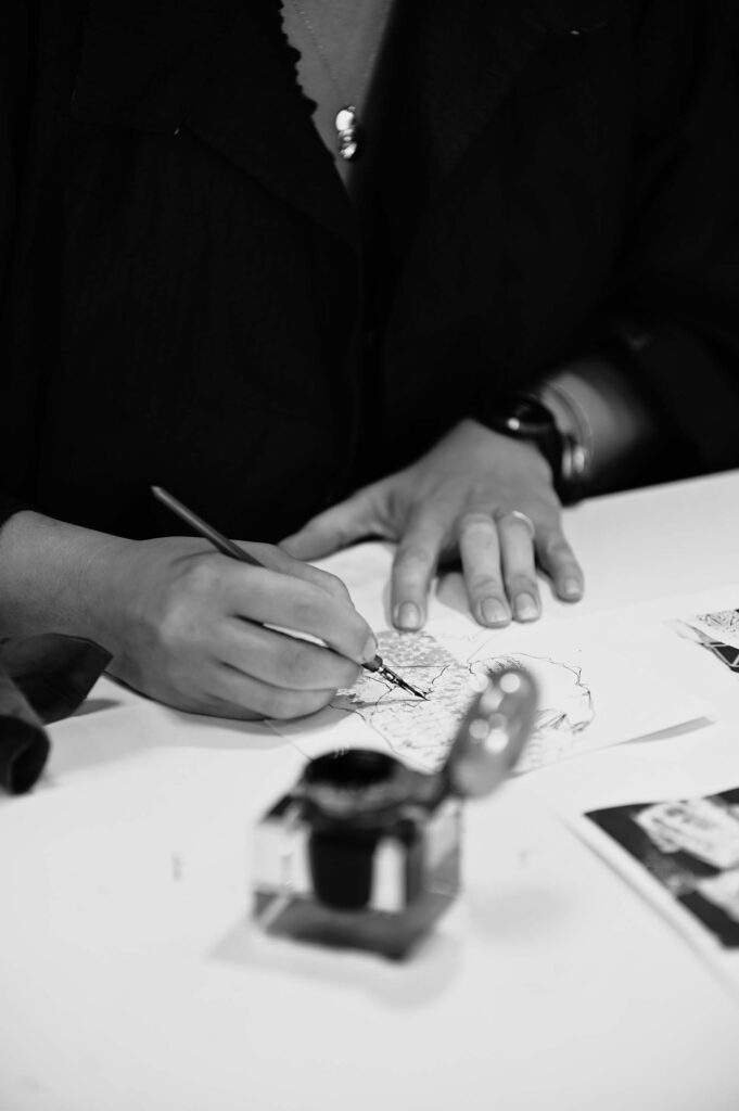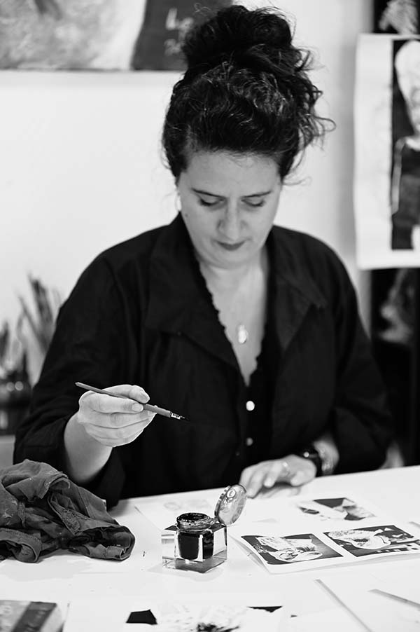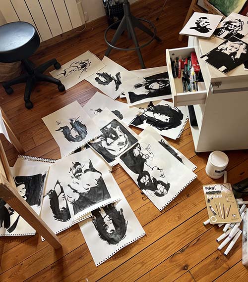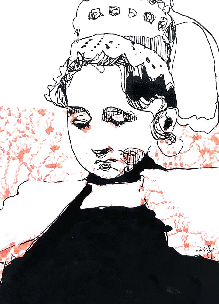 Elle aime saisir l’essence d’un visage, traduire les détails et la délicatesse d’un vêtement ou d’une chevelure par des lignes incisives et libres qui donnent à ses œuvres un aspect moderne.