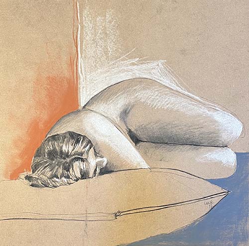 Vingt ans plus tard elle reprend ses crayons, pastels, fusains et lors de séances de modèles vivants, elle tente à présent de saisir plus l’instant que la réalité du sujet. Un instant fugace qui lui permet aussi d’expérimenter différents supports.
