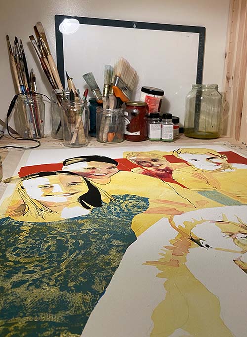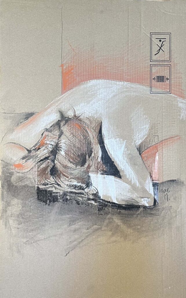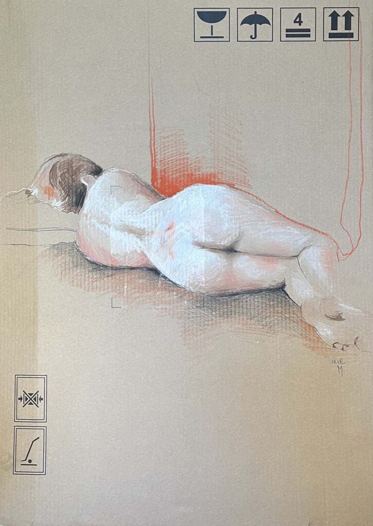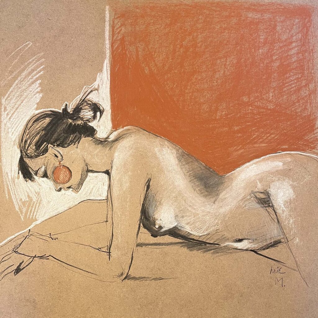Vingt ans plus tard elle reprend ses crayons, pastels, fusains et lors de séances de modèles vivants, elle tente à présent de saisir plus l’instant que la réalité du sujet. Un instant fugace qui lui permet aussi d’expérimenter différents supports.