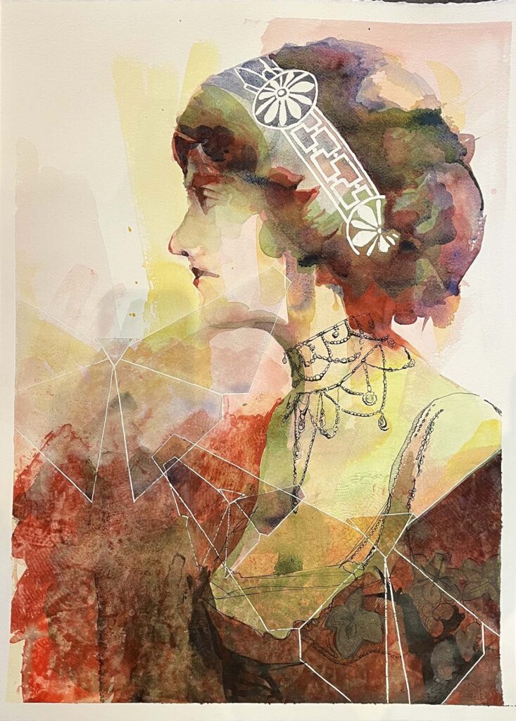 Elle aime saisir l’essence d’un visage, traduire les détails et la délicatesse d’un vêtement ou d’une chevelure par des lignes incisives et libres qui donnent à ses œuvres un aspect moderne.